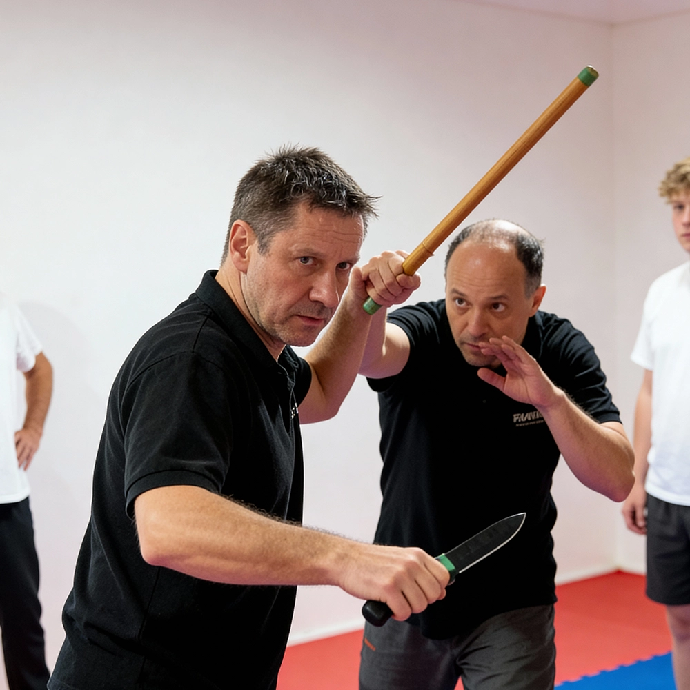 Erwachsene und Jugendliche trainieren, aus der Opferrolle auszusteigen: Gefahrensituationen früh wahrnehmen, klare Signale setzen, Distanz steuern, notfalls konsequent handeln. Statt komplexer Bewegungsfolgen stehen einfache, robuste Prinzipien im Vordergrund.