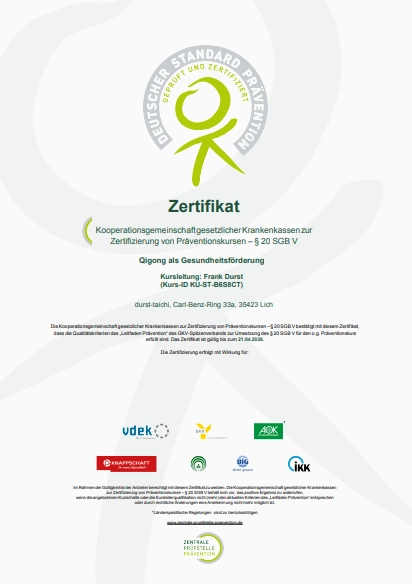 Der Kurs ist von der Kooperationsgemeinschaft der gesetzlichen Krankenkassen gemäß § 20 SGB V zertifiziert. Die Krankenkassen übernehmen bis zu 100 % der Kursgebühren!